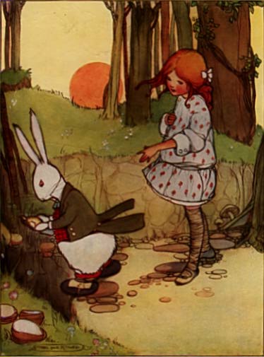 There was nothing so very remarkable in that; nor did Alice think it so very much out of the way to hear the Rabbit say to itself, “Oh dear! Oh dear! I shall be too late!” (when she thought it over afterward, it occurred to her that she ought to have wondered at this, but at the time it all seemed quite natural); but, when the Rabbit actually took a watch out of its waistcoat-pocket, and looked at it, and then hurried on, Alice started to her feet, for it flashed across her mind that she had never before seen a rabbit with either a waistcoat-pocket, or a watch to take out of it, and, burning with curiosity, she ran across the field after it, and was just in time to see it pop down a large rabbit-hole under the hedge.