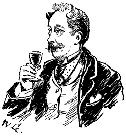 While playing dominoes with Cummings in the parlour, he said: “By- the-by, do you want any wine or spirits? My cousin Merton has just set up in the trade, and has a splendid whisky, four years in bottle, at thirty-eight shillings. It is worth your while laying down a few dozen of it.” I told him my cellars, which were very small, were full up. To my horror, at that very moment, Sarah entered the room, and putting a bottle of whisky, wrapped in a dirty piece of newspaper, on the table in front of us, said: "Please, sir, the grocer says he ain’t got no more Kinahan, but you’ll find this very good at two-and-six, with twopence returned on the bottle; and, please, did you want any more sherry? as he has some at one-and-three, as dry as a nut!”