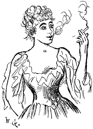 We were introduced to Miss Posh, whom Lupin called “Little Girl," as if he had known her all his life. She was very tall, rather plain, and I thought she was a little painted round the eyes. I hope I am wrong; but she had such fair hair, and yet her eyebrows were black. She looked about thirty. I did not like the way she kept giggling and giving Lupin smacks and pinching him. Then her laugh was a sort of a scream that went right through my ears, all the more irritating because there was nothing to laugh at. In fact, Carrie and I were not at all prepossessed with her. They all smoked cigarettes after dinner, including Miss Posh, who startled Carrie by saying: “Don’t you smoke, dear?” I answered for Carrie, and said: “Mrs. Charles Pooter has not arrived at it yet," whereupon Miss Posh gave one of her piercing laughs again.